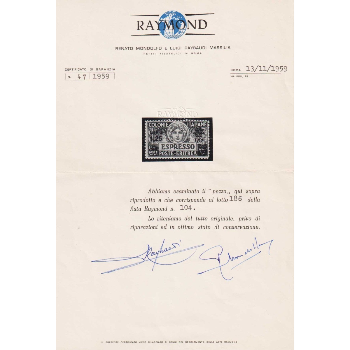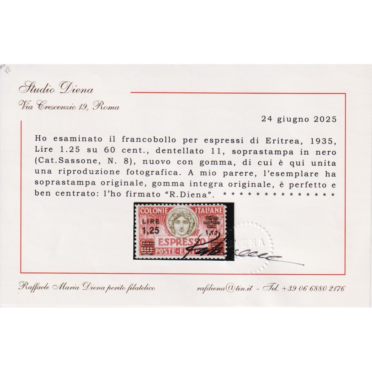 COLONIE ERITREA 1927-35 ESPRESSO RARO 1,25 SU 60 CENT. N.8 G.I MNH** 2 CERT.