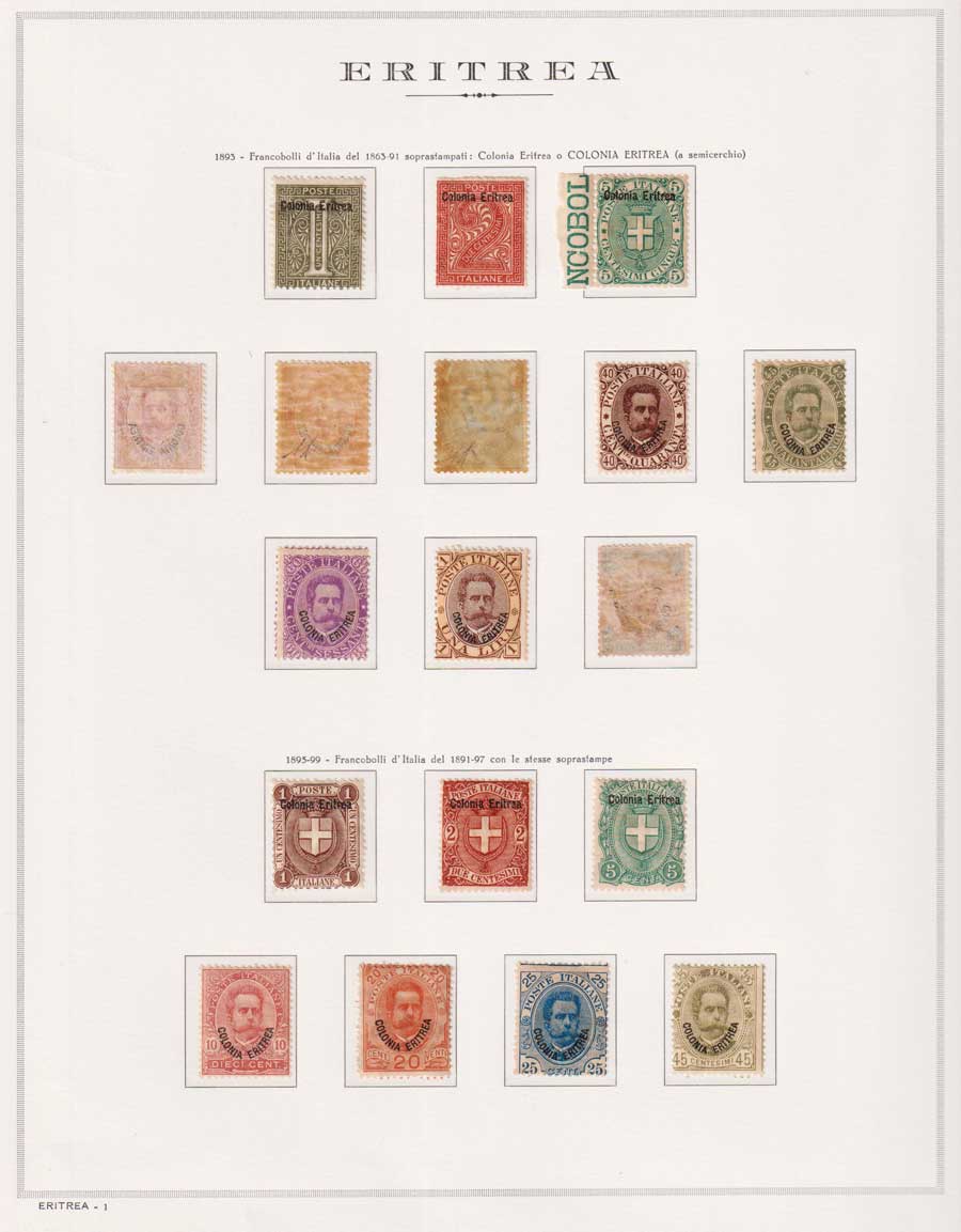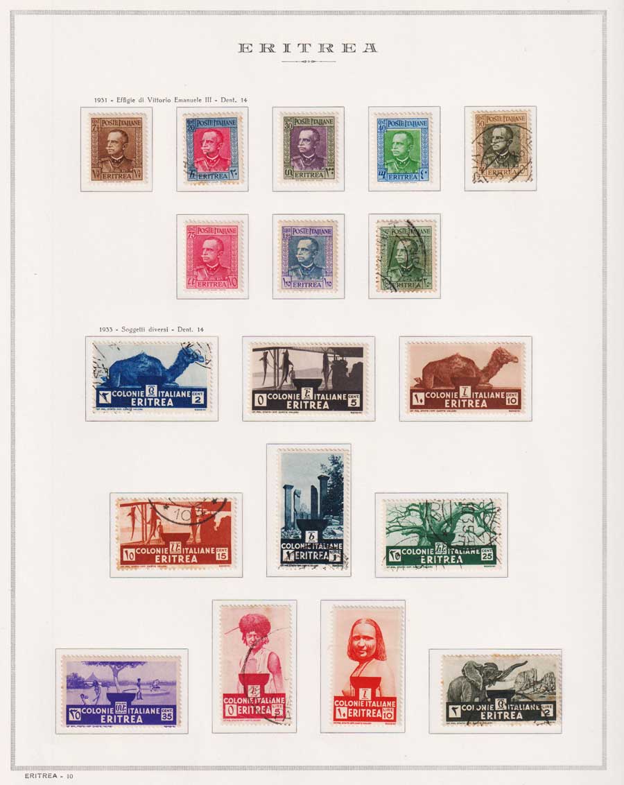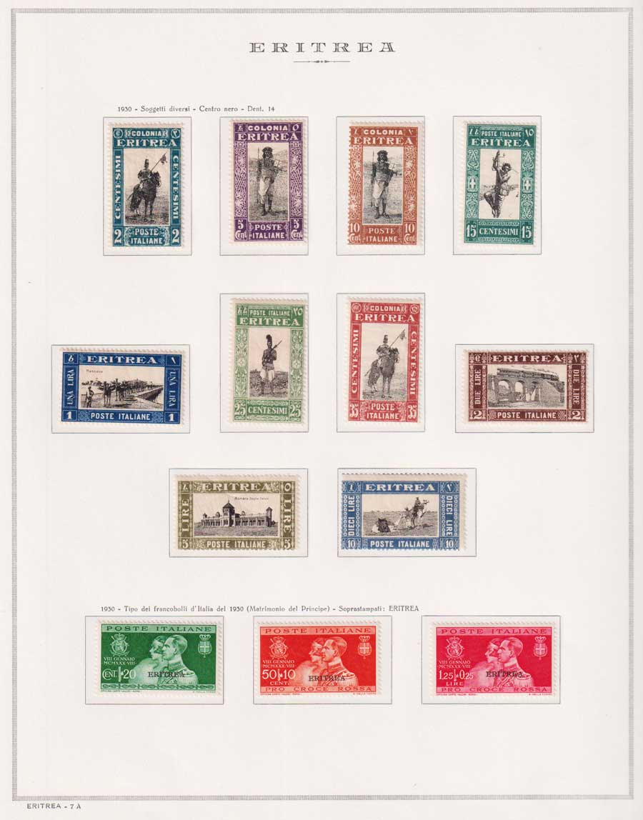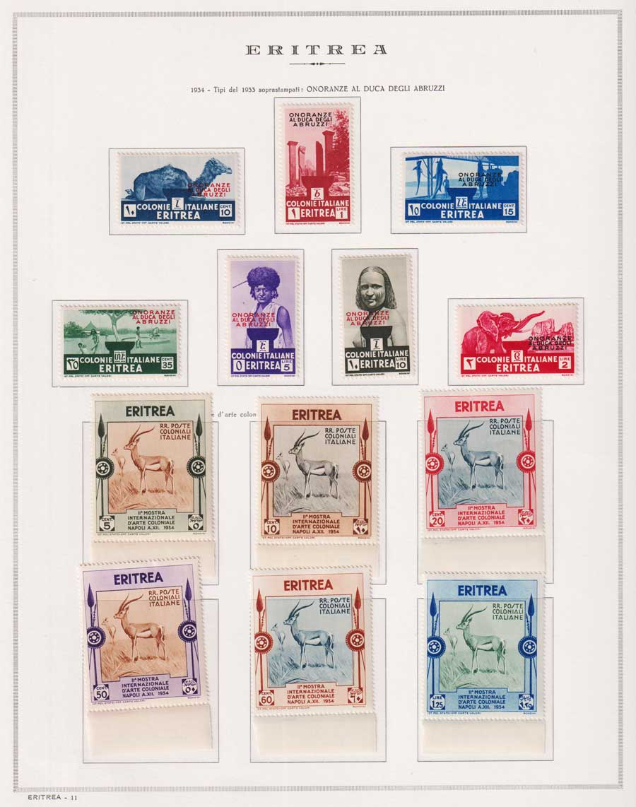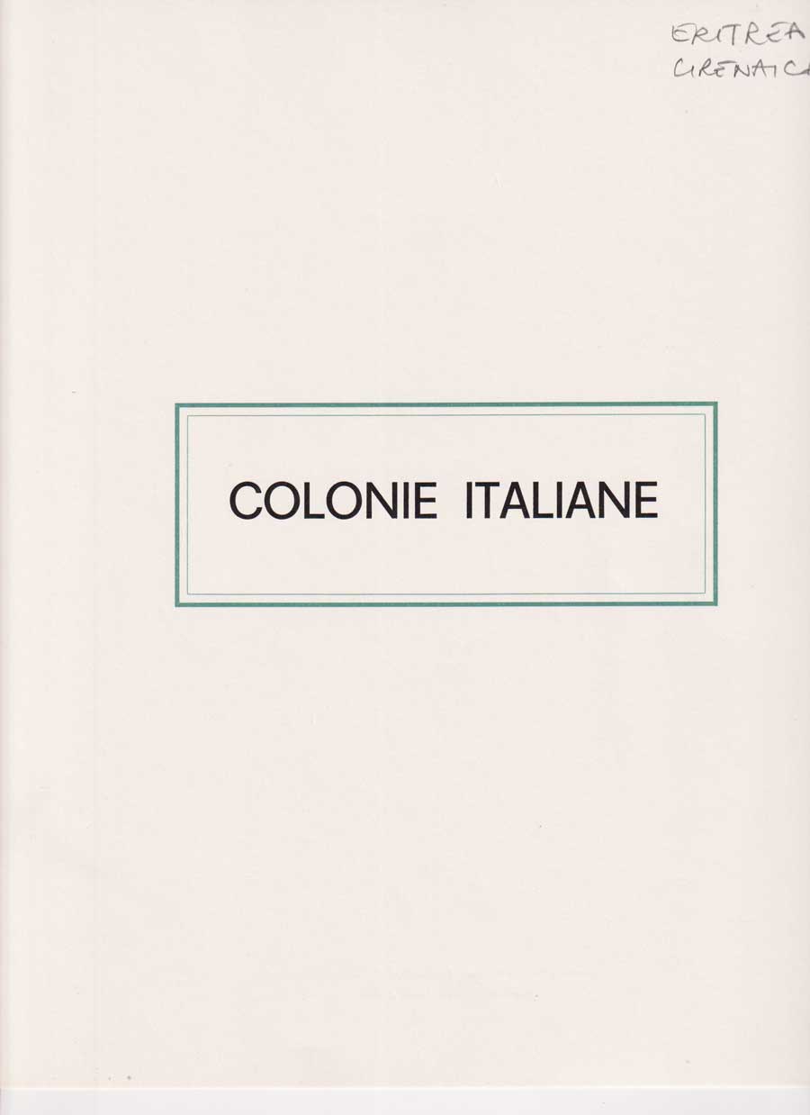 COLLEZIONE AVANZATA DI ERITREA E CIRENAICA SU ALBUM E FOGLI MARINI CON CUSTODIA. TUTTI I FRANCOBOLLI PRESENTI NELLA RACCOLTA SONO VISIBILI NELLE SCANSIONI, SONO IN OTTIMO STATO DI CONSERVAZIONE E PREVALENTEMENTE CON GOMMA ORIGINALE. VALORE DI CATALOGO 20600 CIRCA.