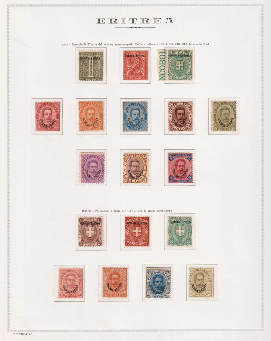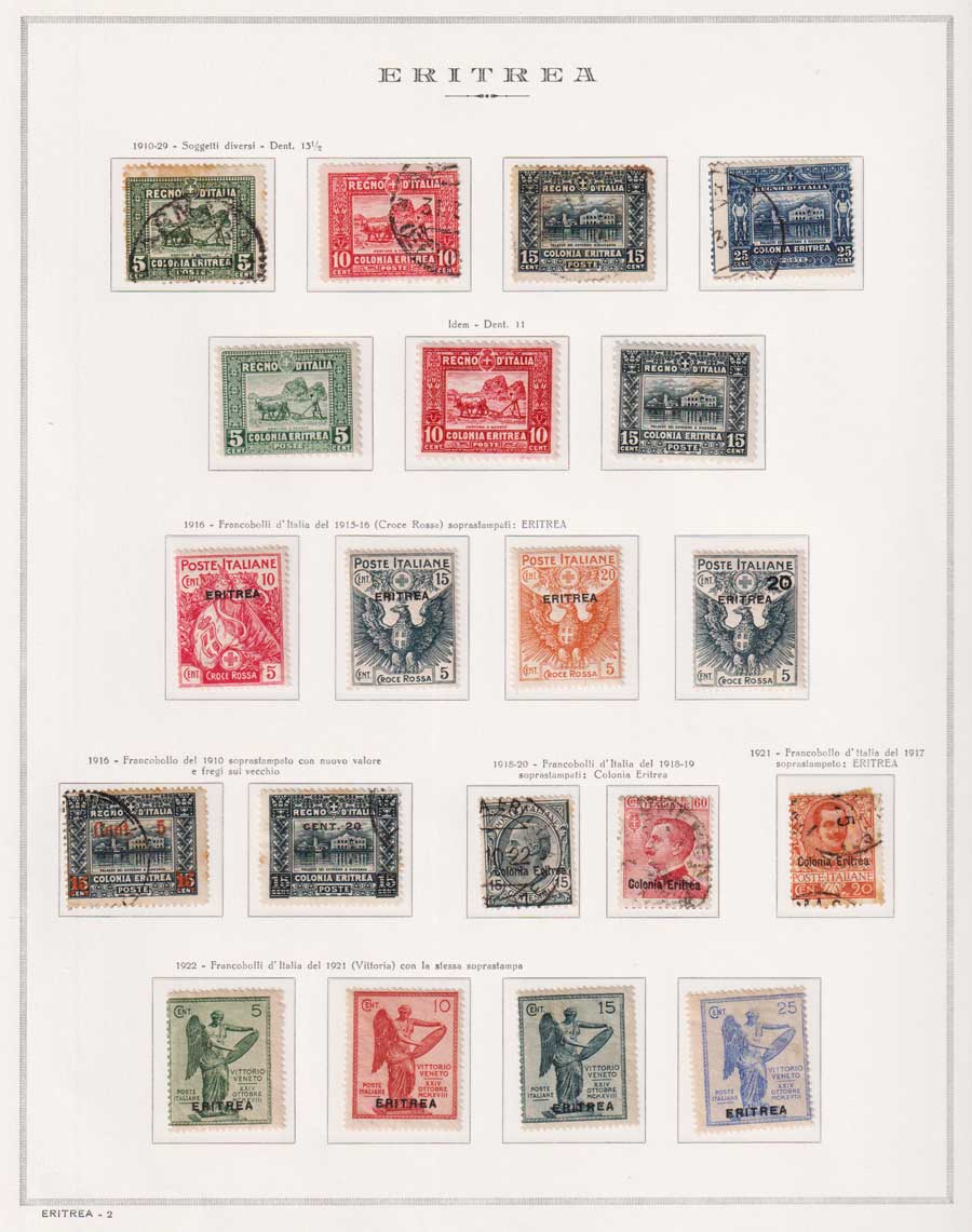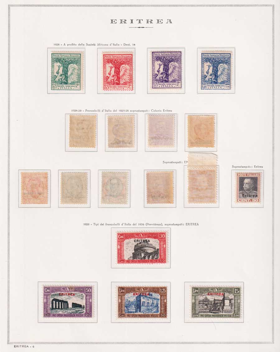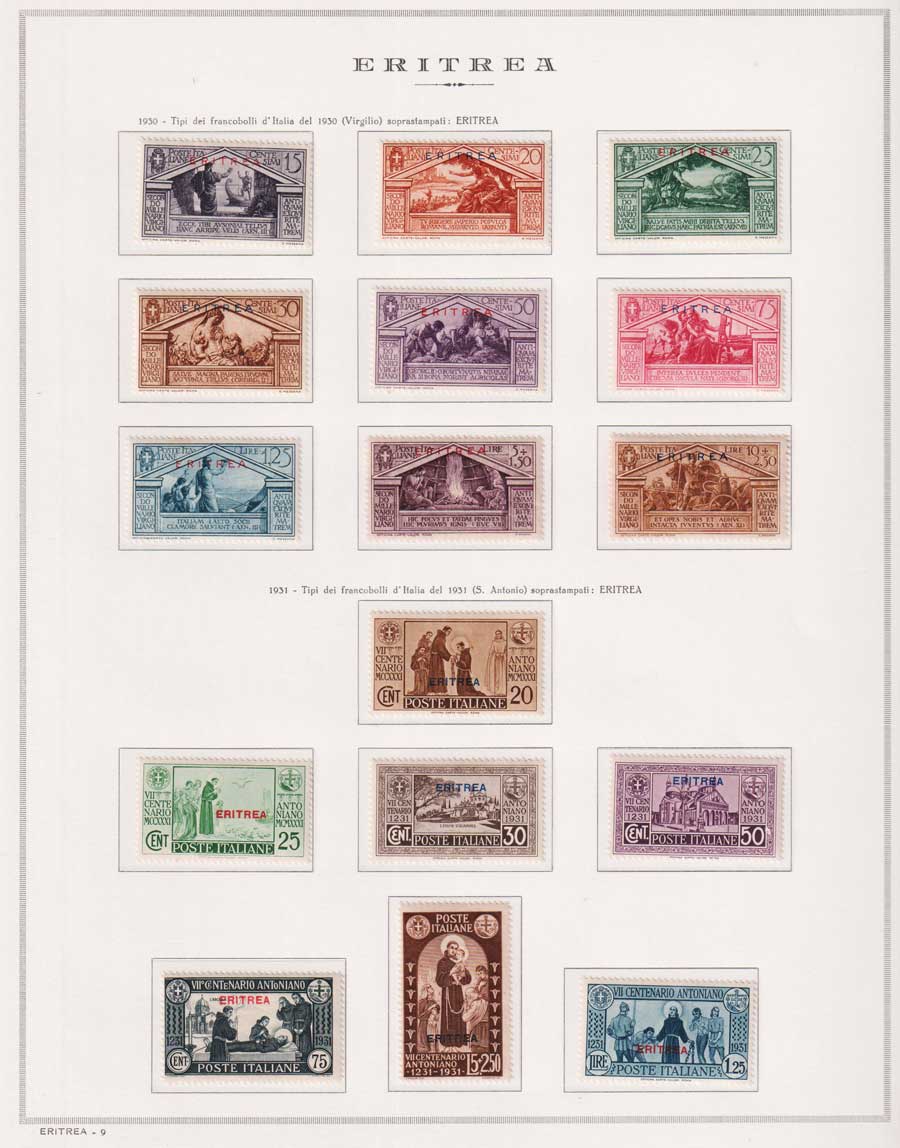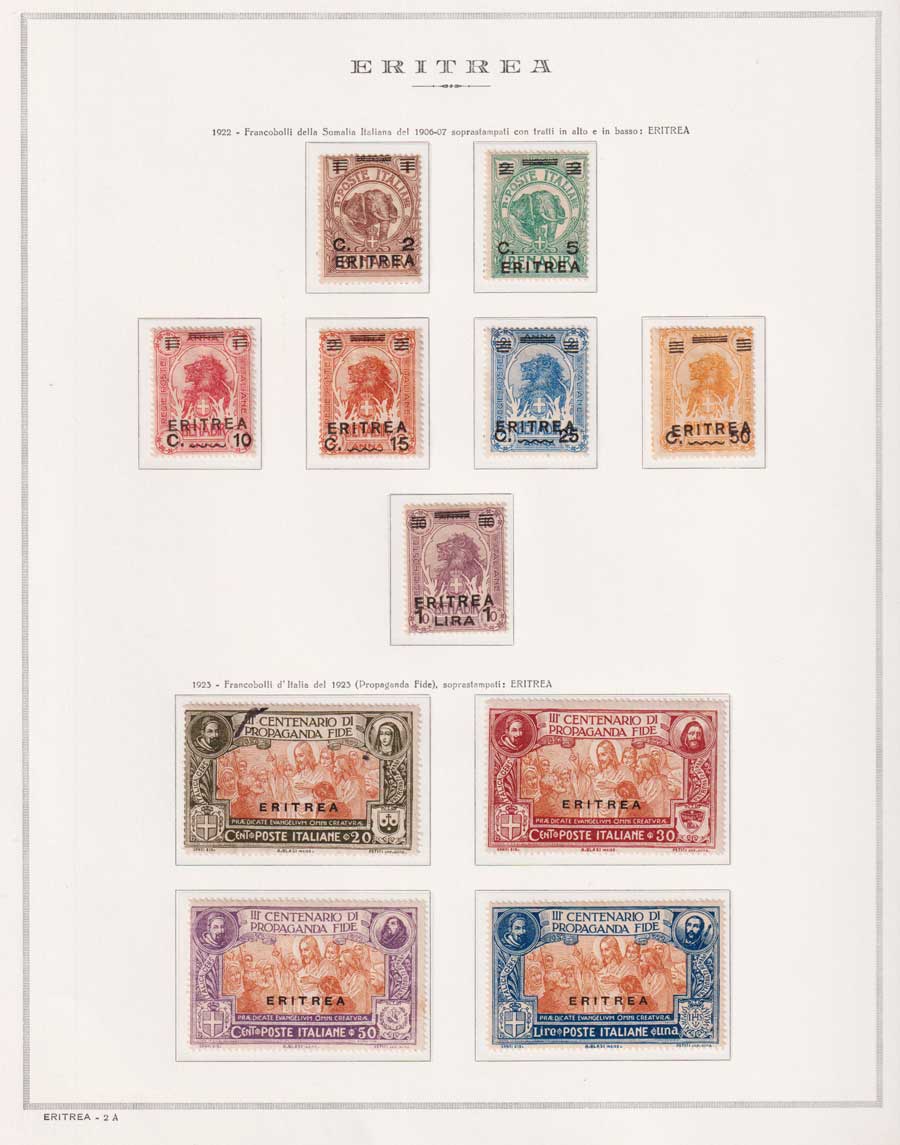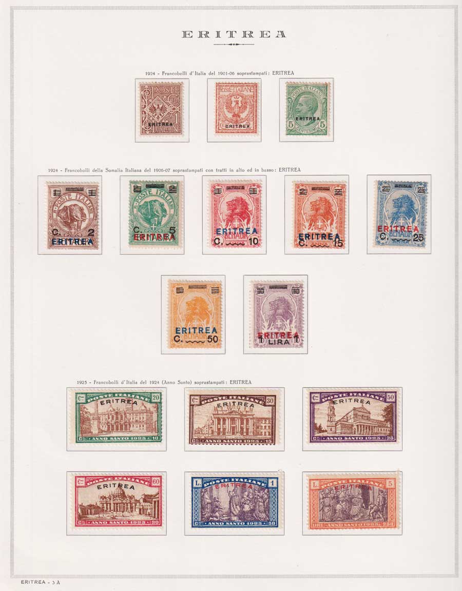 COLLEZIONE AVANZATA DI ERITREA E CIRENAICA SU ALBUM E FOGLI MARINI CON CUSTODIA. TUTTI I FRANCOBOLLI PRESENTI NELLA RACCOLTA SONO VISIBILI NELLE SCANSIONI, SONO IN OTTIMO STATO DI CONSERVAZIONE E PREVALENTEMENTE CON GOMMA ORIGINALE. VALORE DI CATALOGO 20600 CIRCA.