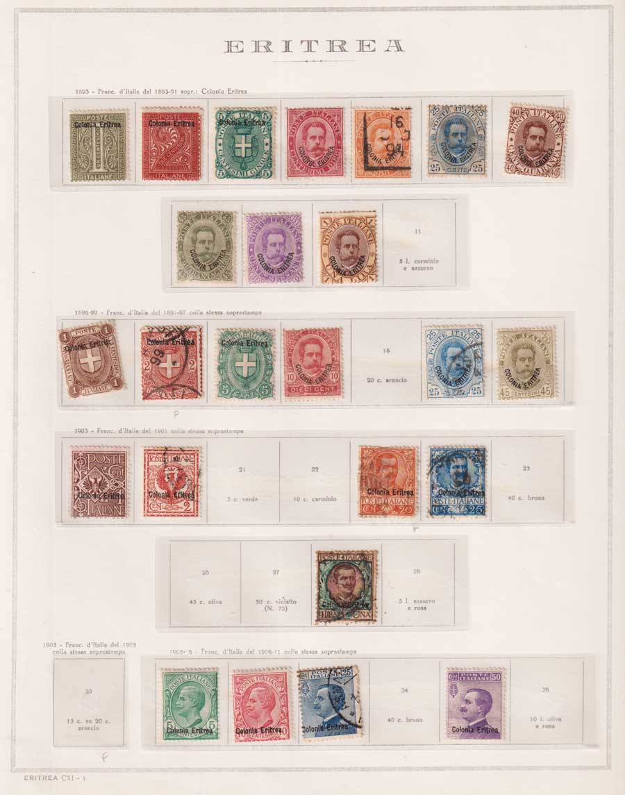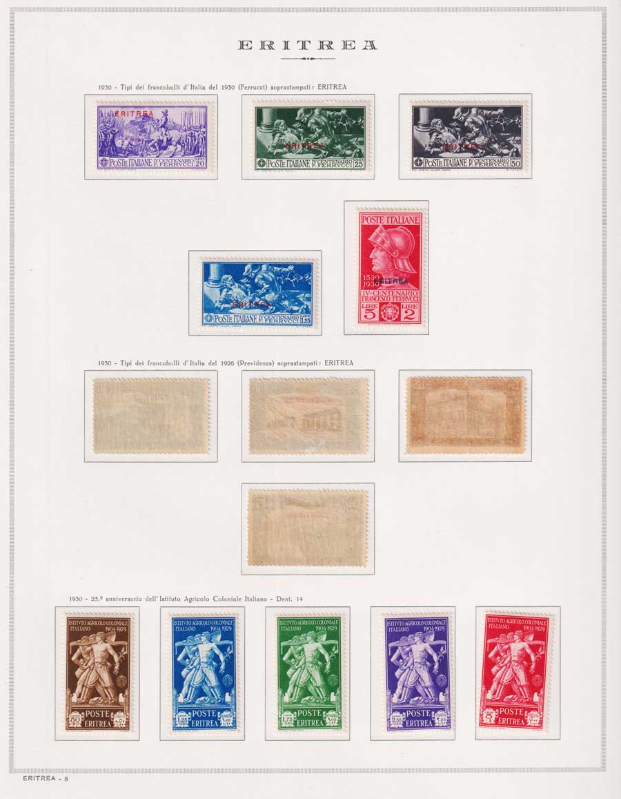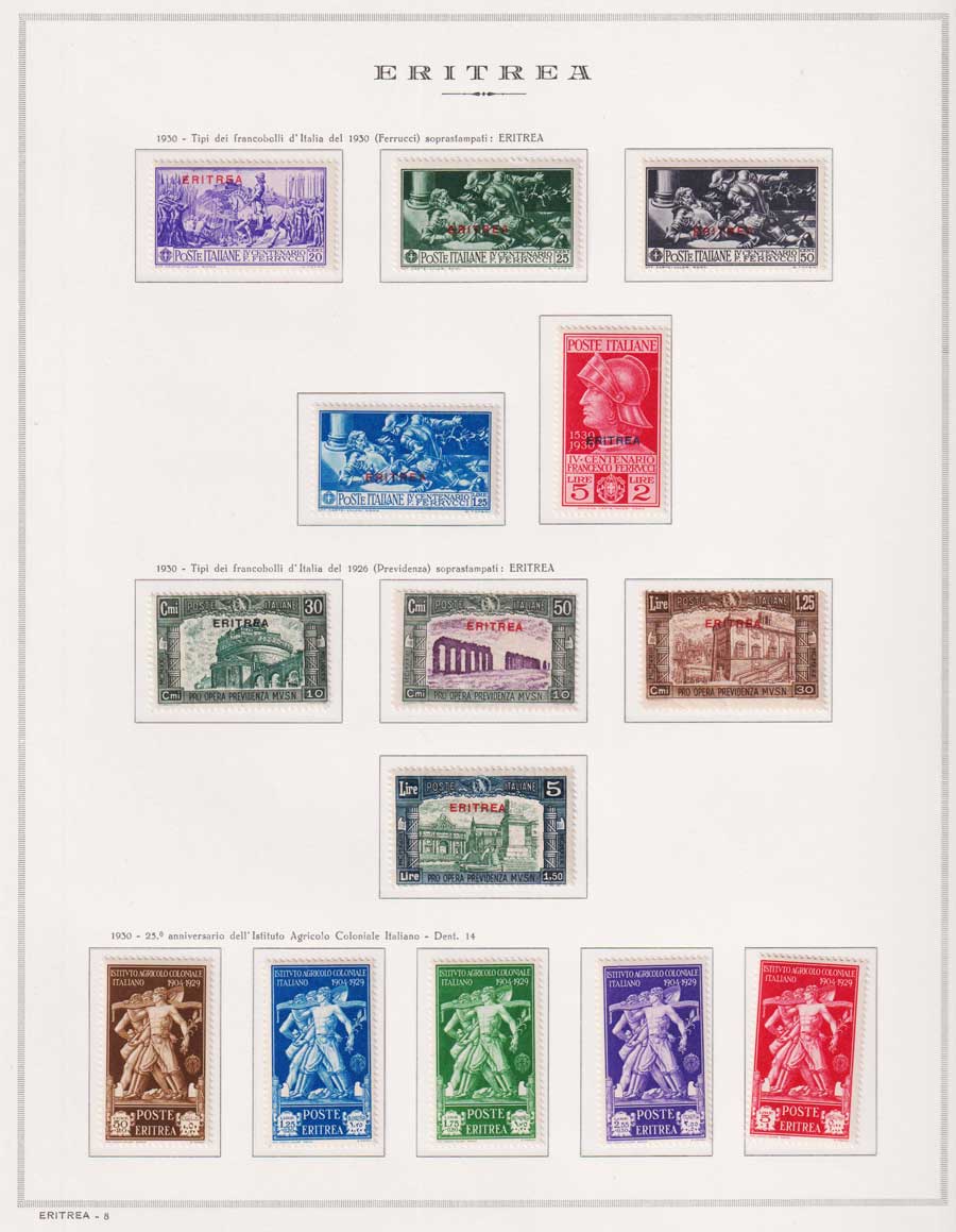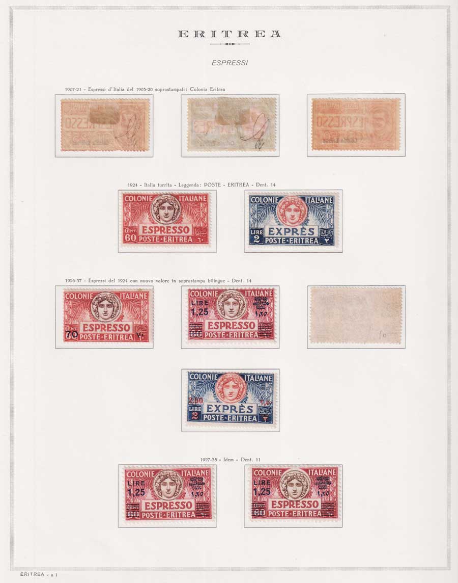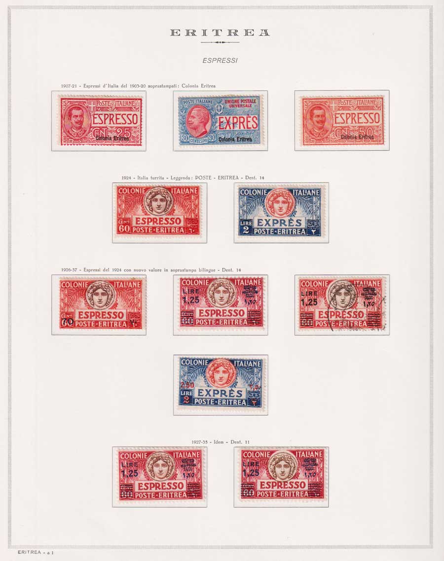 COLLEZIONE AVANZATA DI ERITREA E CIRENAICA SU ALBUM E FOGLI MARINI CON CUSTODIA. TUTTI I FRANCOBOLLI PRESENTI NELLA RACCOLTA SONO VISIBILI NELLE SCANSIONI, SONO IN OTTIMO STATO DI CONSERVAZIONE E PREVALENTEMENTE CON GOMMA ORIGINALE. VALORE DI CATALOGO 20600 CIRCA.