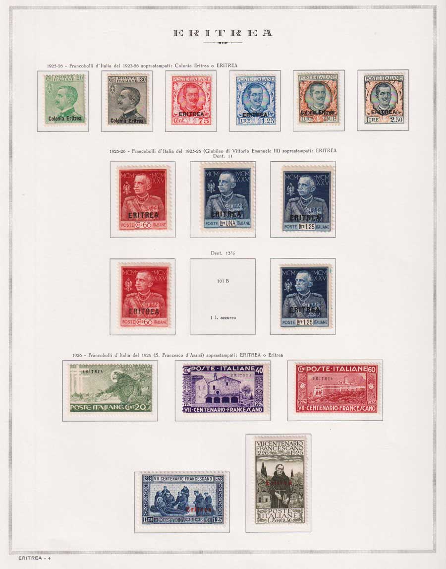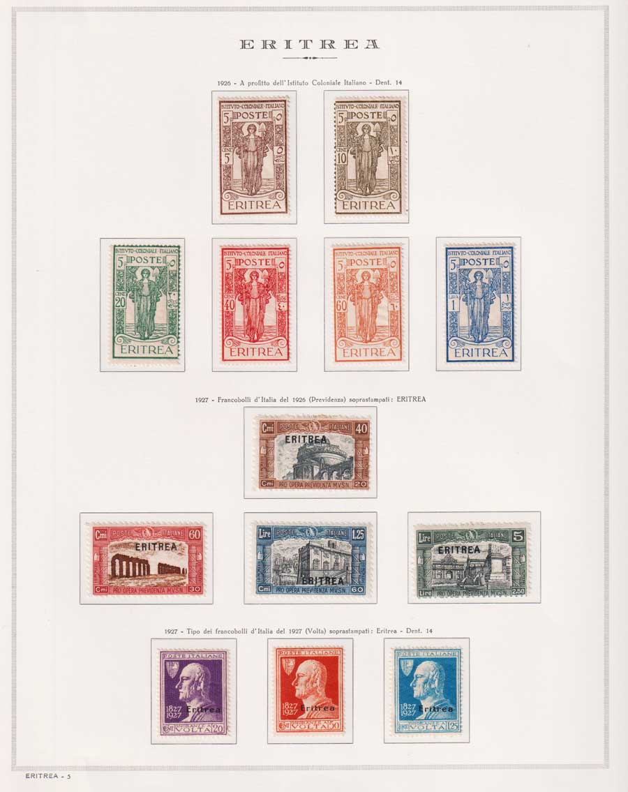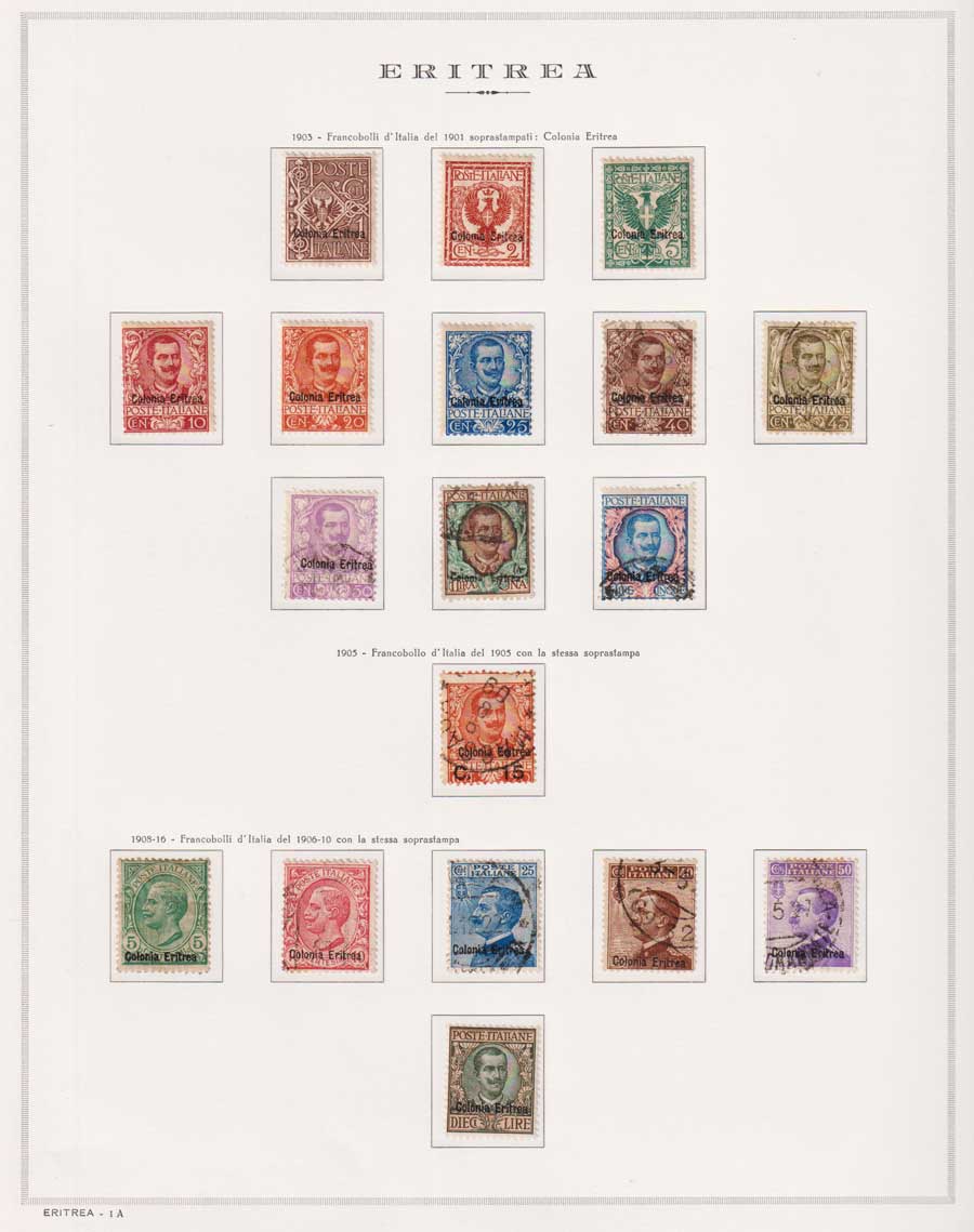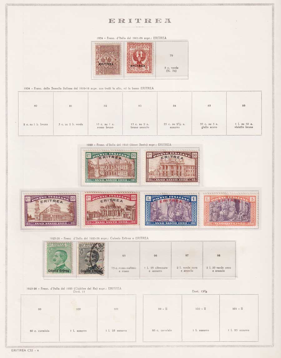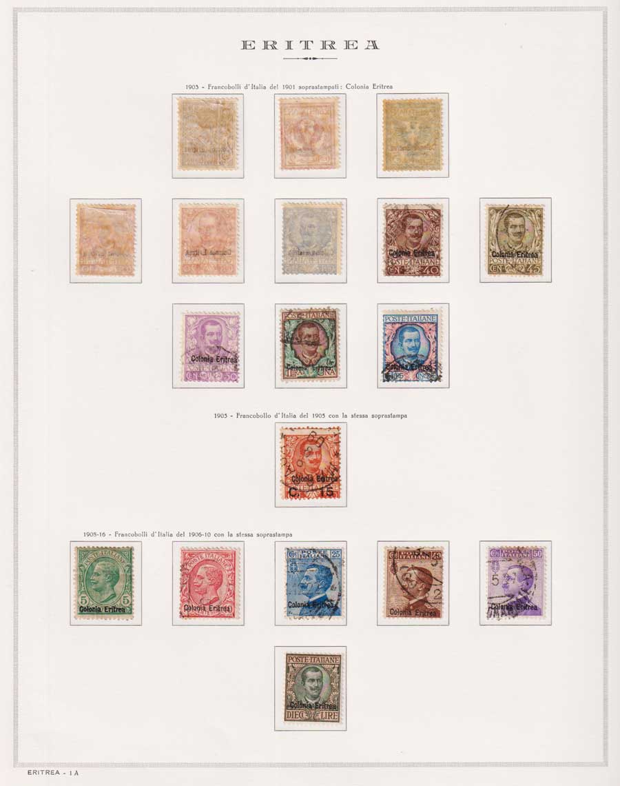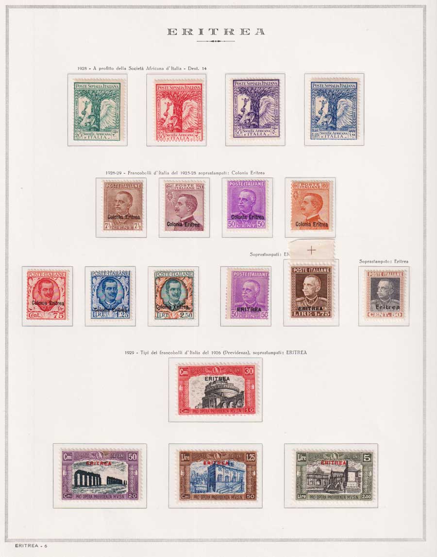 COLLEZIONE AVANZATA DI ERITREA E CIRENAICA SU ALBUM E FOGLI MARINI CON CUSTODIA. TUTTI I FRANCOBOLLI PRESENTI NELLA RACCOLTA SONO VISIBILI NELLE SCANSIONI, SONO IN OTTIMO STATO DI CONSERVAZIONE E PREVALENTEMENTE CON GOMMA ORIGINALE. VALORE DI CATALOGO 20600 CIRCA.