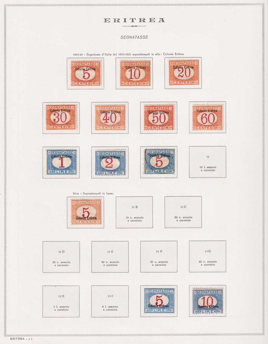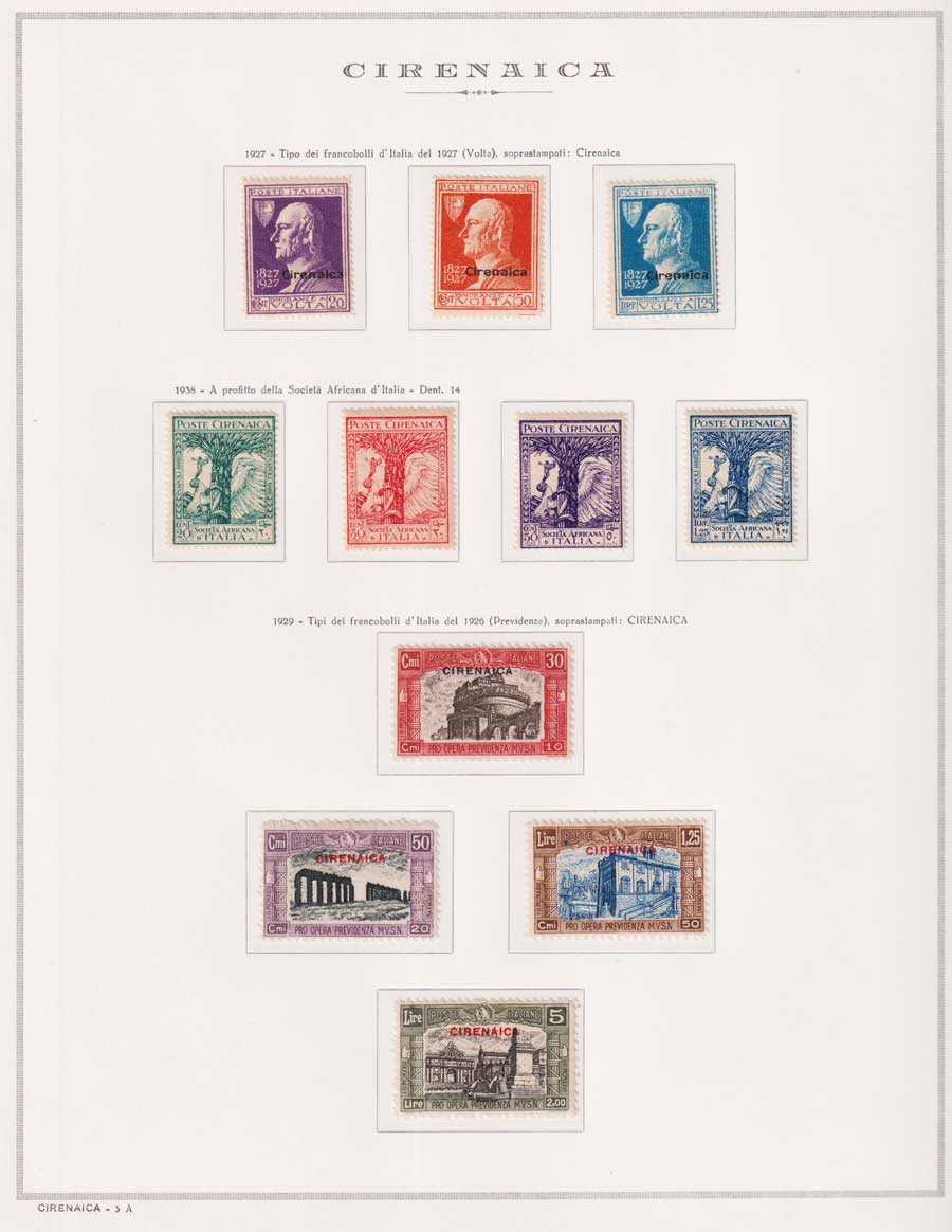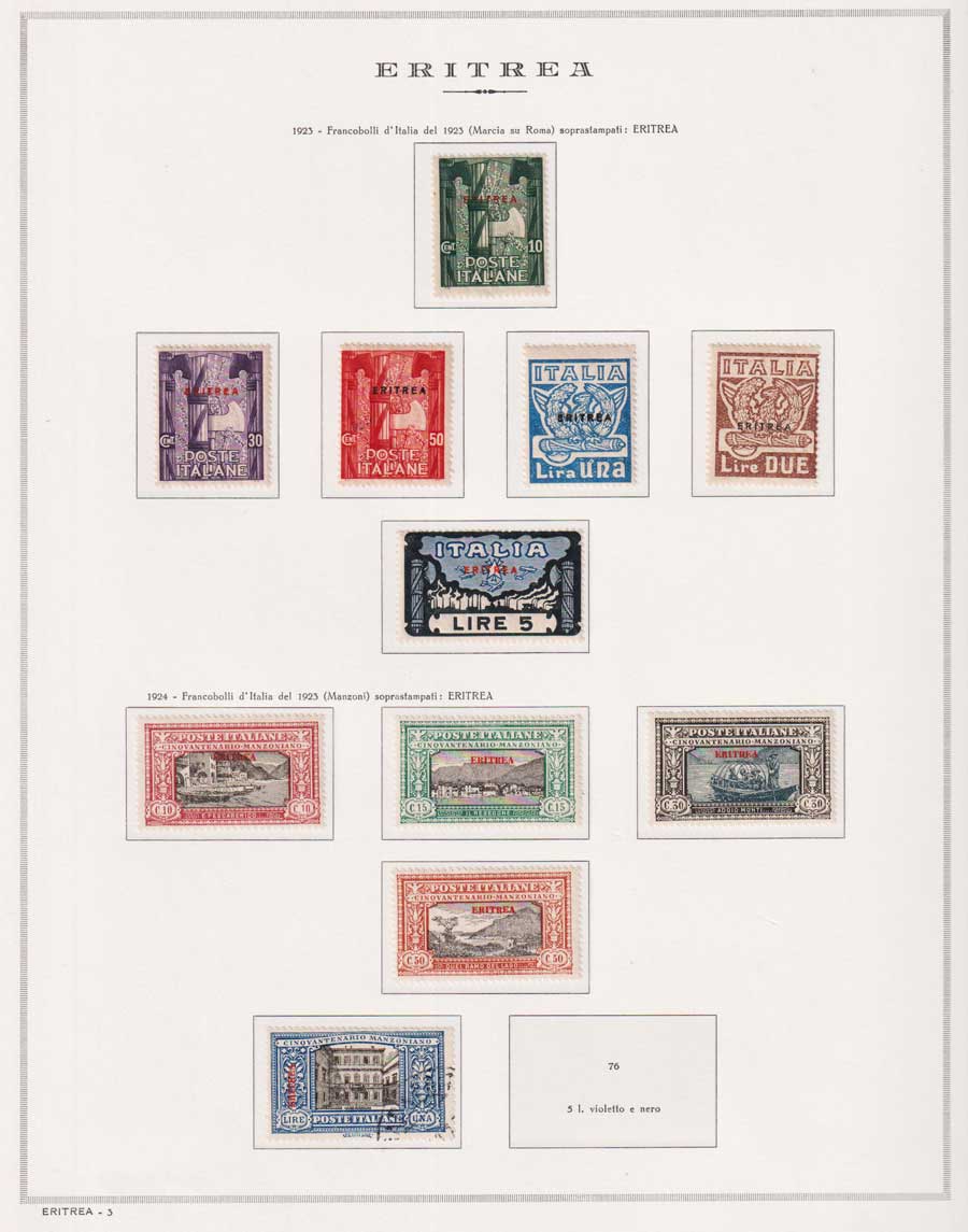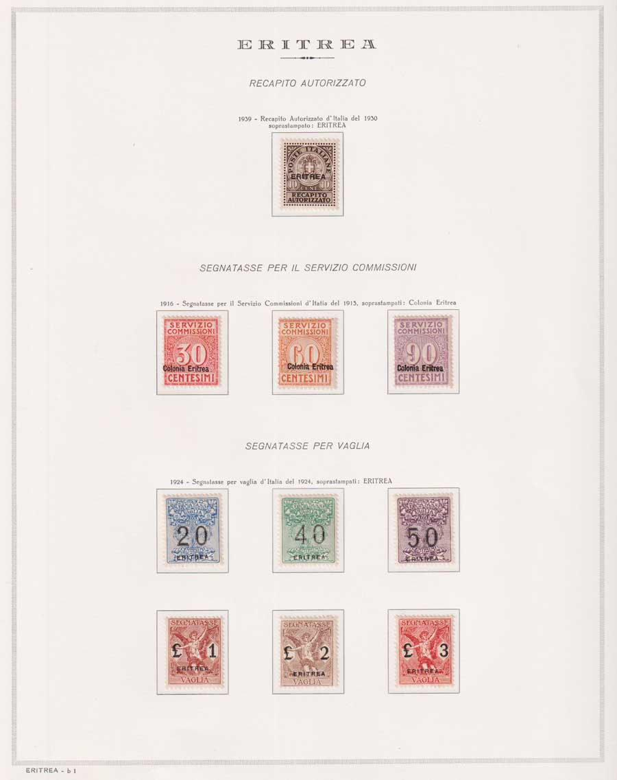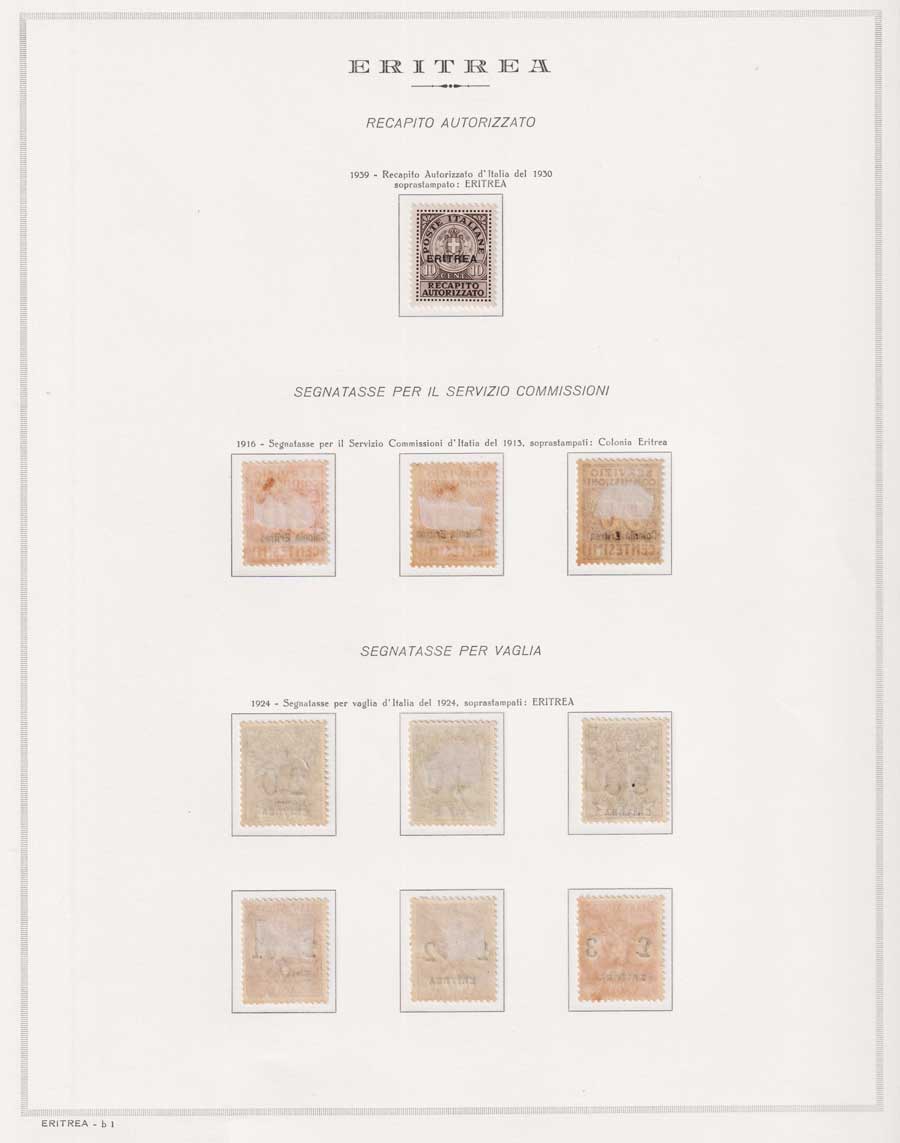 COLLEZIONE AVANZATA DI ERITREA E CIRENAICA SU ALBUM E FOGLI MARINI CON CUSTODIA. TUTTI I FRANCOBOLLI PRESENTI NELLA RACCOLTA SONO VISIBILI NELLE SCANSIONI, SONO IN OTTIMO STATO DI CONSERVAZIONE E PREVALENTEMENTE CON GOMMA ORIGINALE. VALORE DI CATALOGO 20600 CIRCA.
