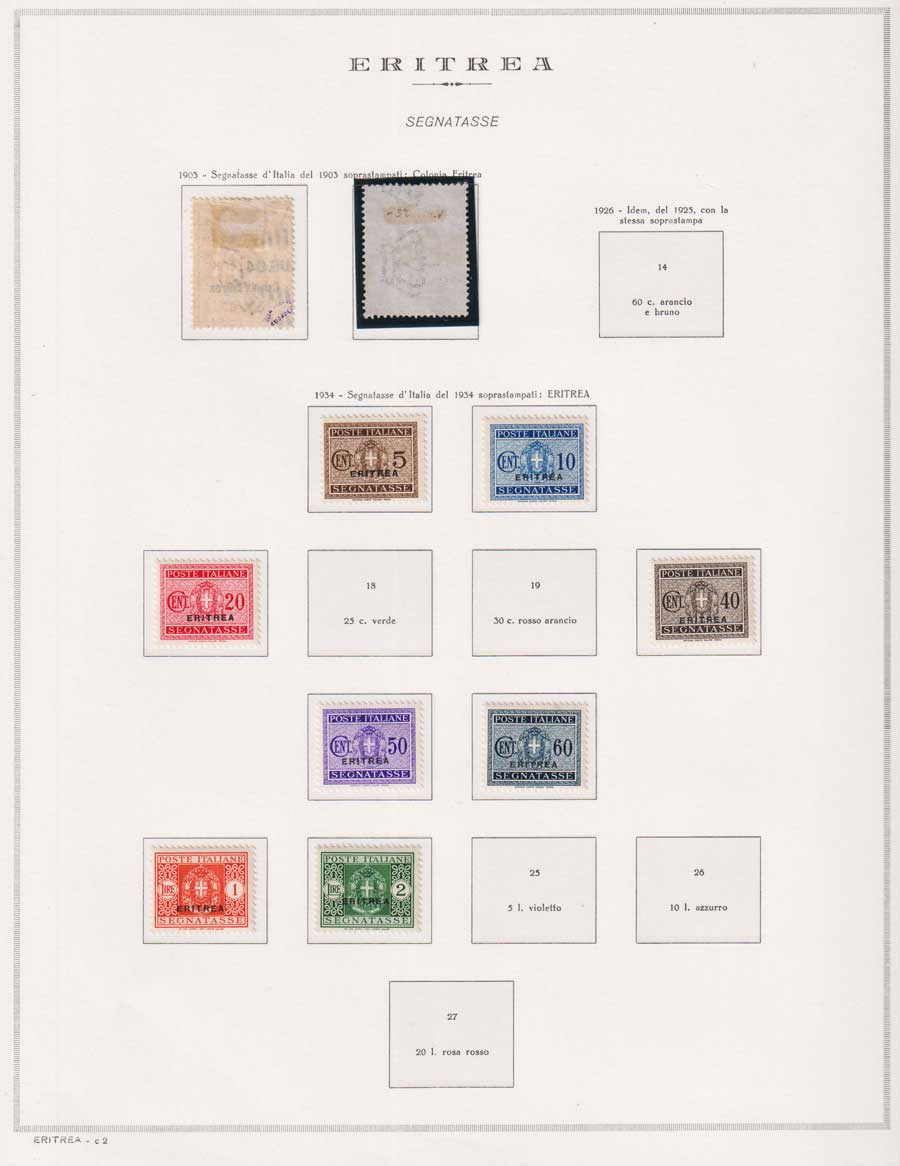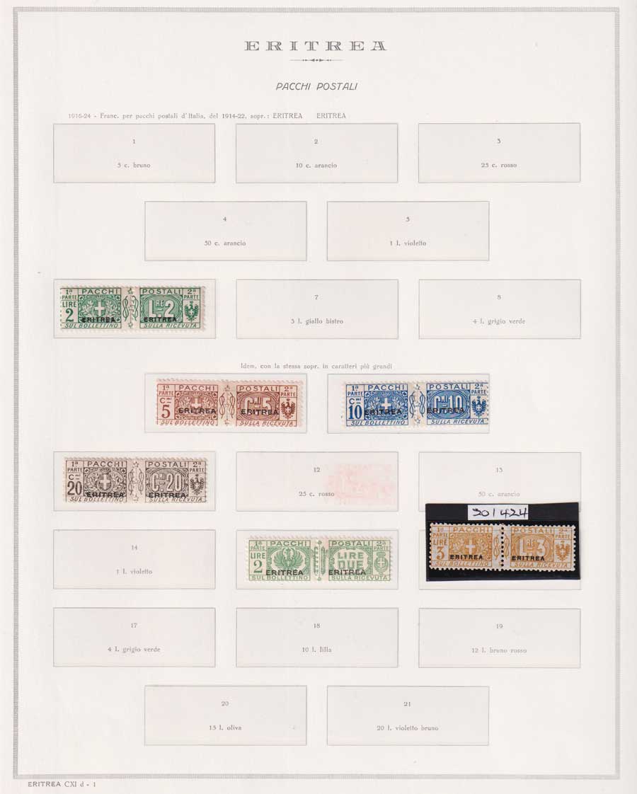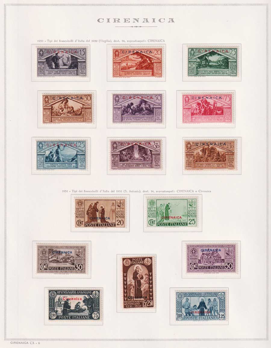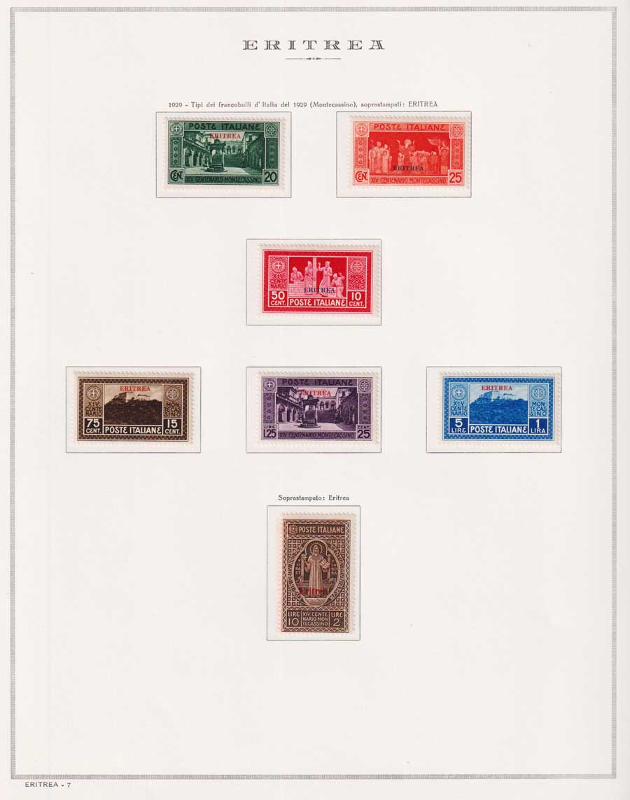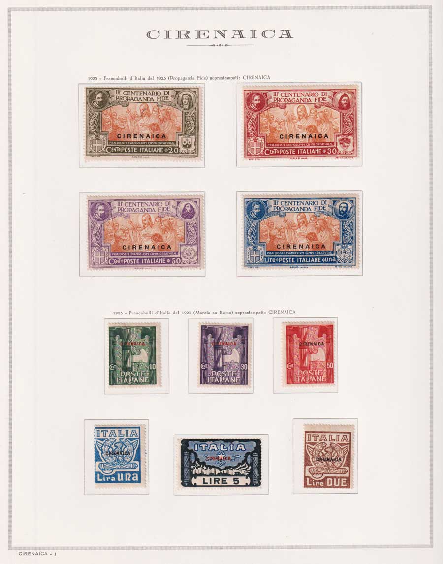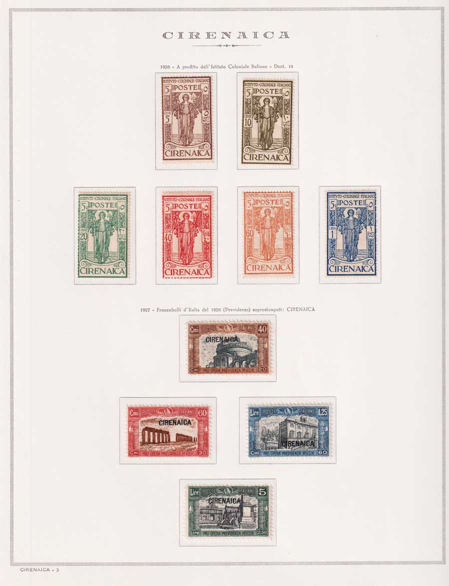 COLLEZIONE AVANZATA DI ERITREA E CIRENAICA SU ALBUM E FOGLI MARINI CON CUSTODIA. TUTTI I FRANCOBOLLI PRESENTI NELLA RACCOLTA SONO VISIBILI NELLE SCANSIONI, SONO IN OTTIMO STATO DI CONSERVAZIONE E PREVALENTEMENTE CON GOMMA ORIGINALE. VALORE DI CATALOGO 20600 CIRCA.