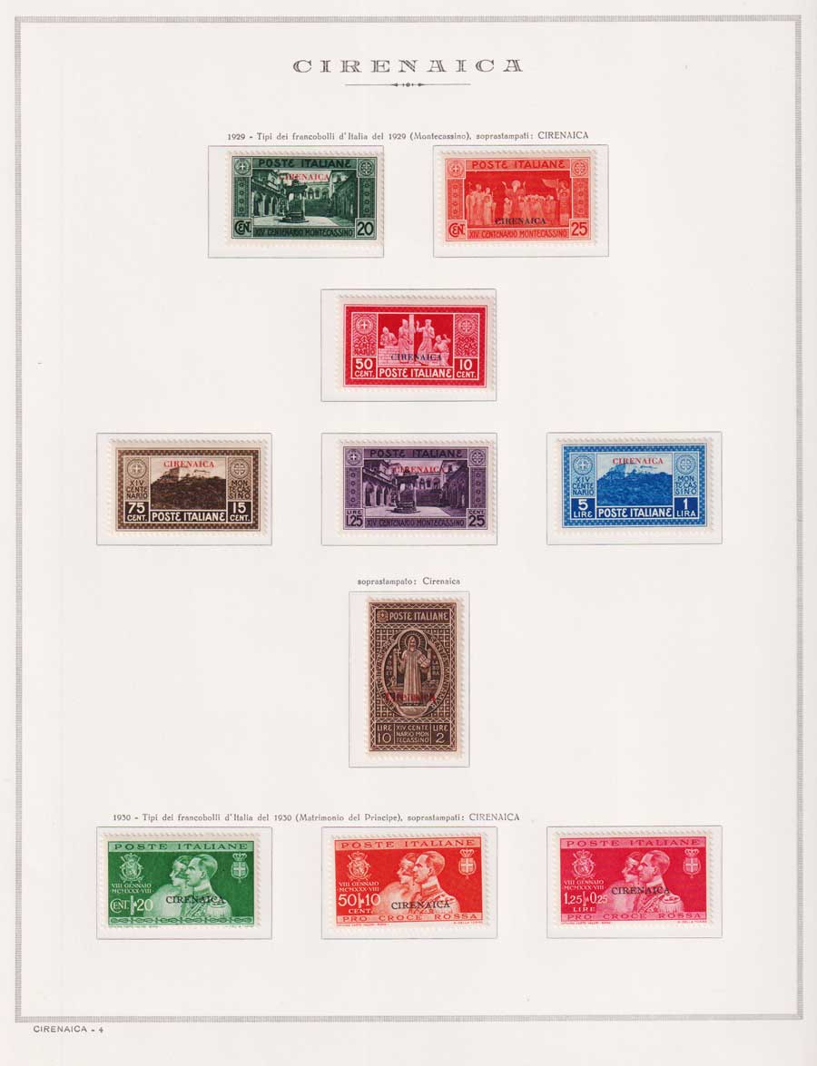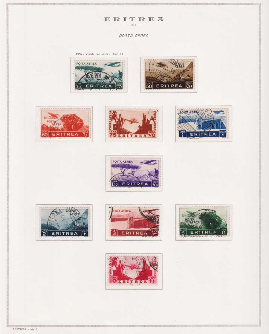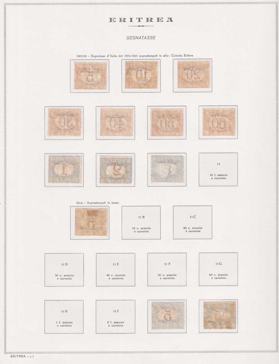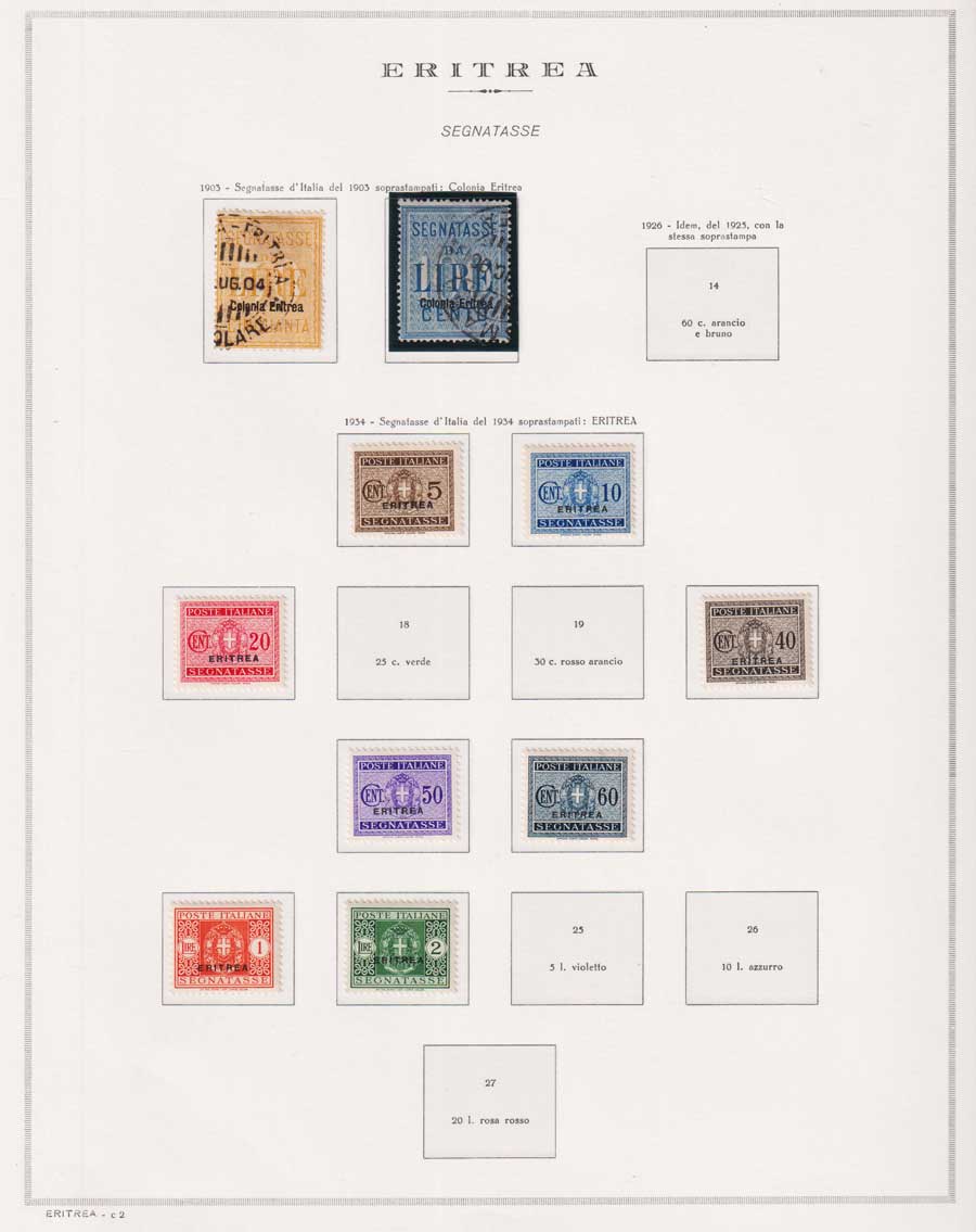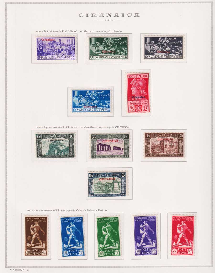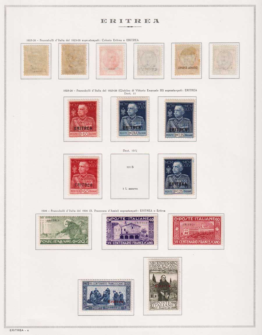 COLLEZIONE AVANZATA DI ERITREA E CIRENAICA SU ALBUM E FOGLI MARINI CON CUSTODIA. TUTTI I FRANCOBOLLI PRESENTI NELLA RACCOLTA SONO VISIBILI NELLE SCANSIONI, SONO IN OTTIMO STATO DI CONSERVAZIONE E PREVALENTEMENTE CON GOMMA ORIGINALE. VALORE DI CATALOGO 20600 CIRCA.