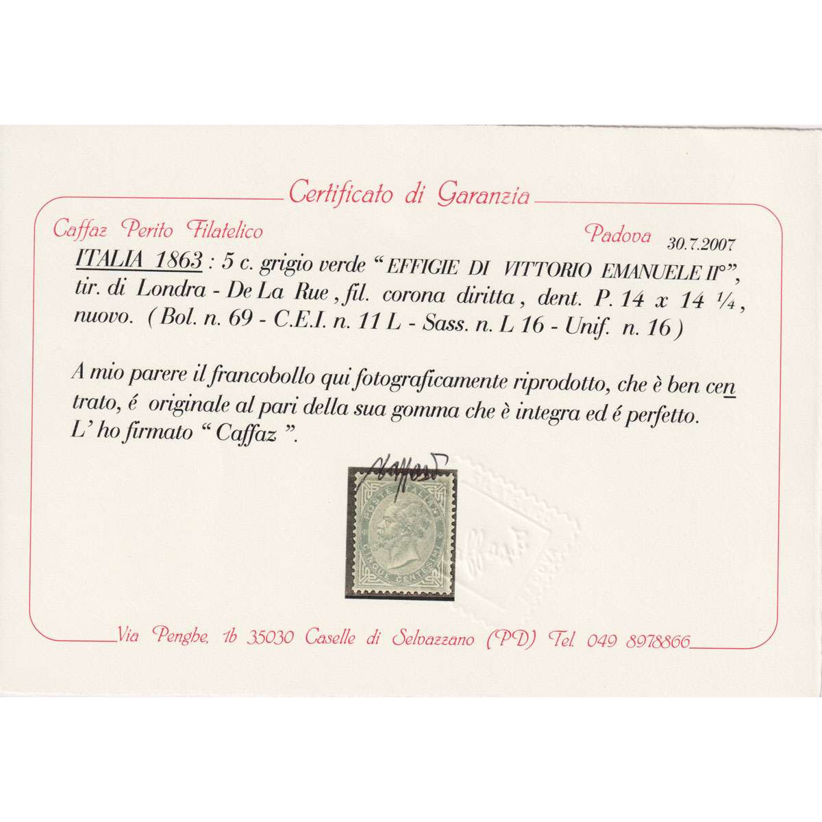 REGNO 1863-65 5 CENTESIMI TIR. LONDRA DE LA RUE N.L16 G.I MNH** CERT.