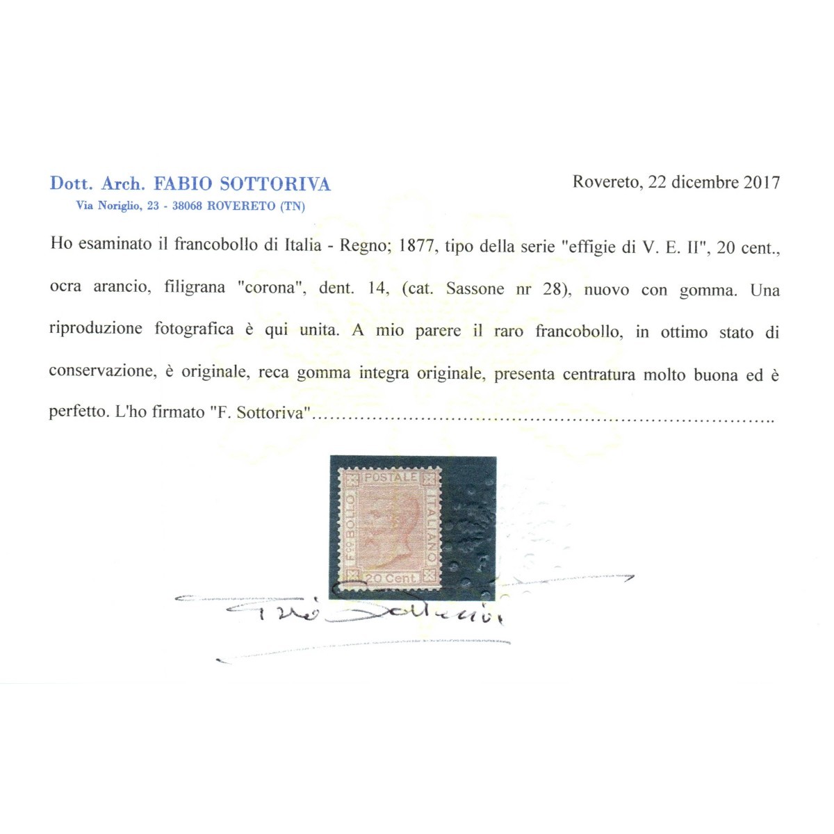 REGNO D'ITALIA 1877 20 CENTESIMI N.28 G.I MNH** CERT. CENTRATO