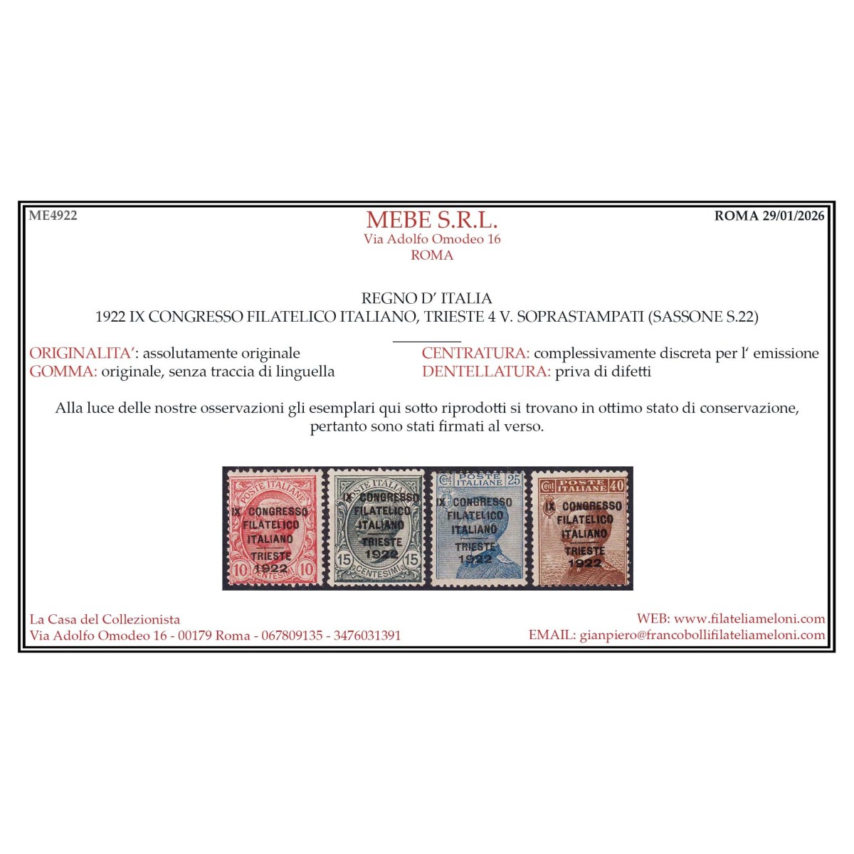 REGNO D'ITALIA 1922 CONGRESSO FILATELICO...