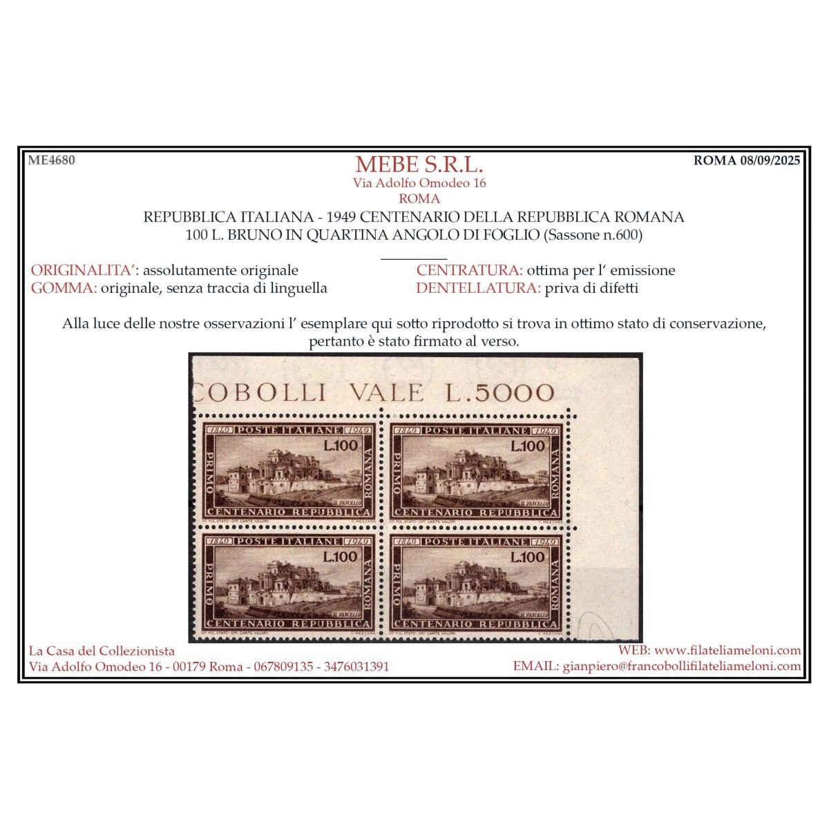 REPUBBLICA 1949 QUARTINA ALFIERI G.I MNH**
