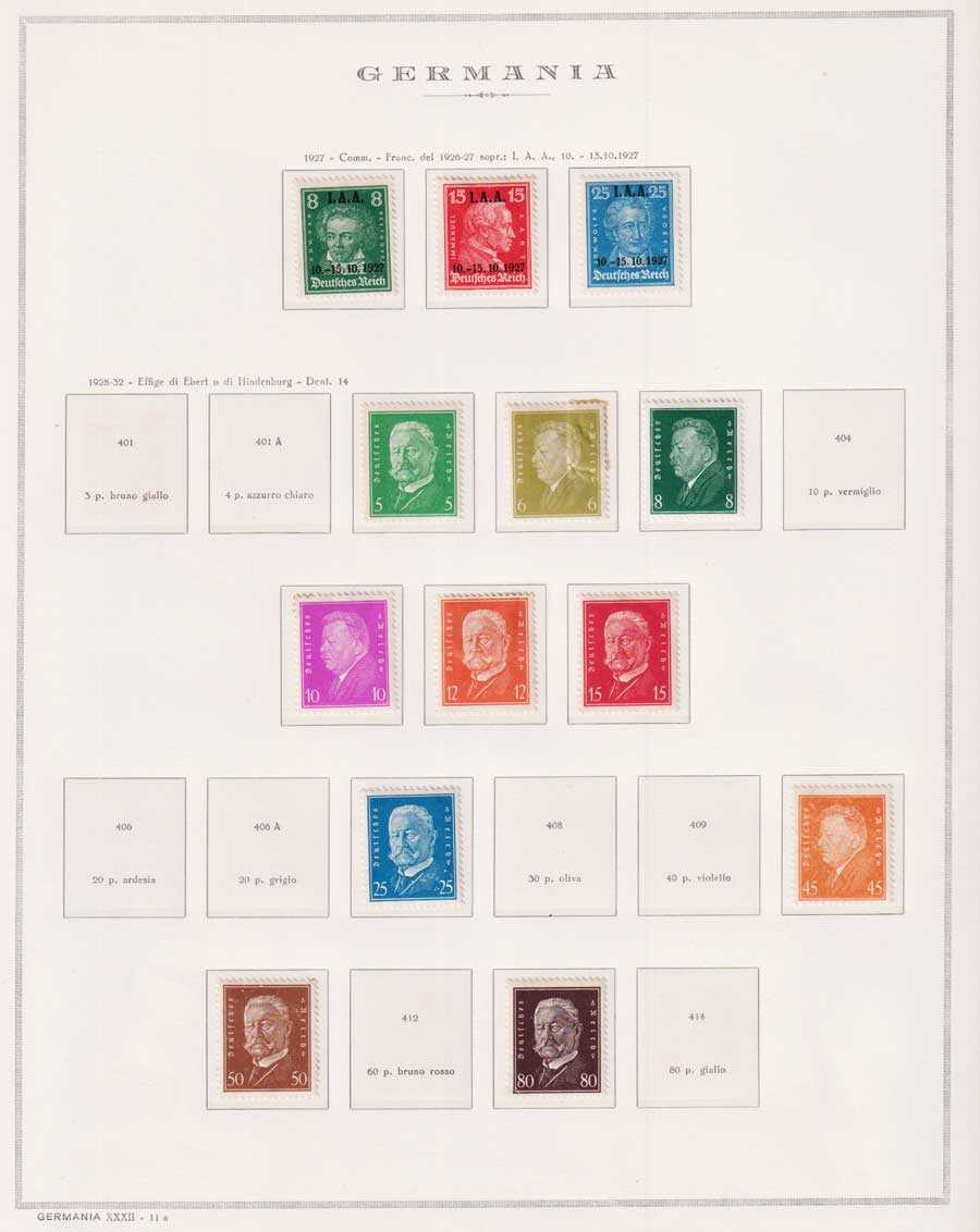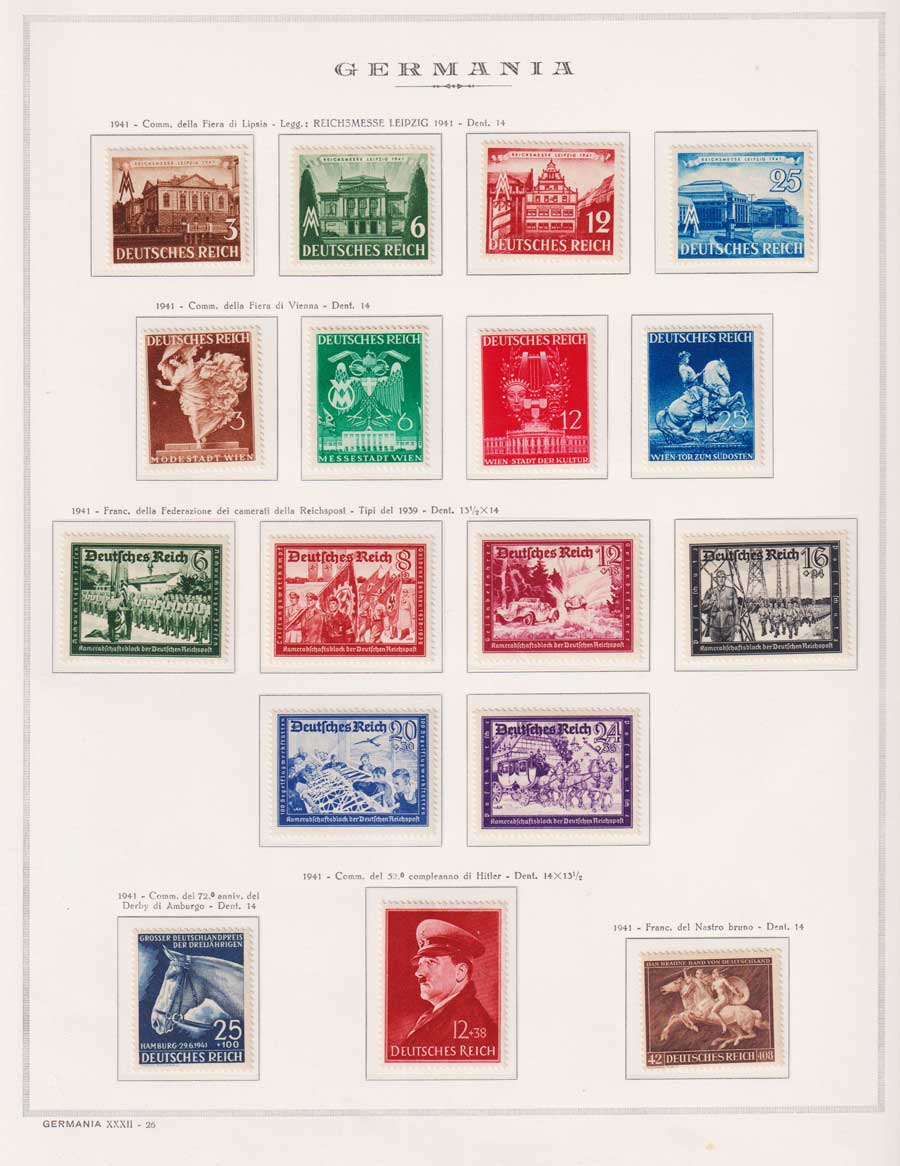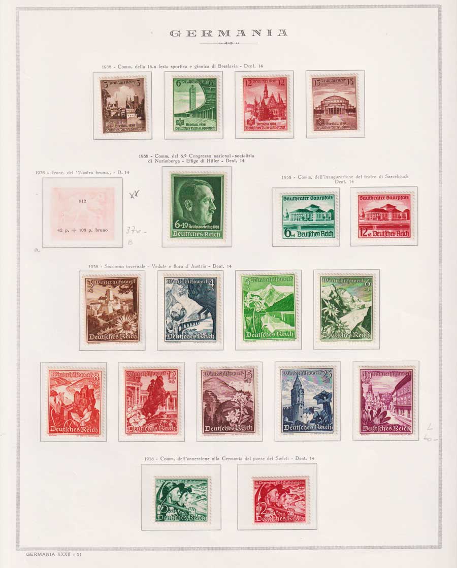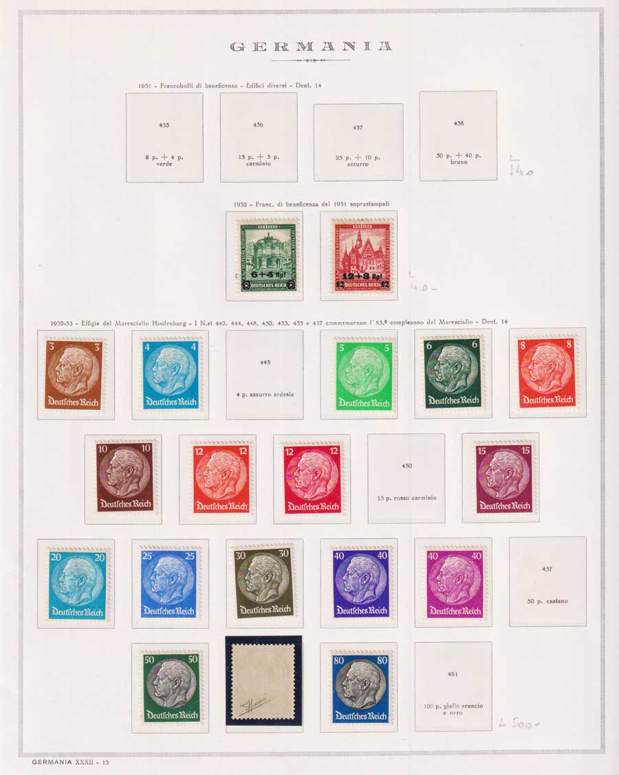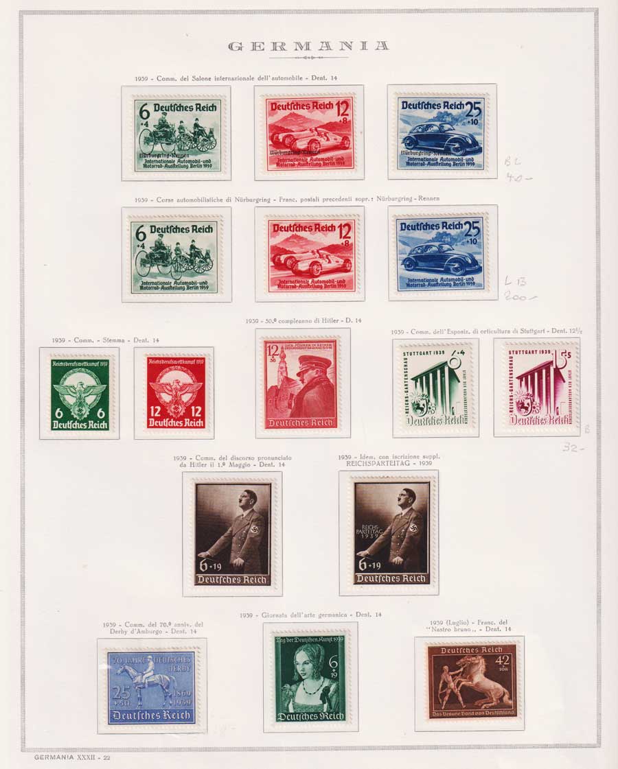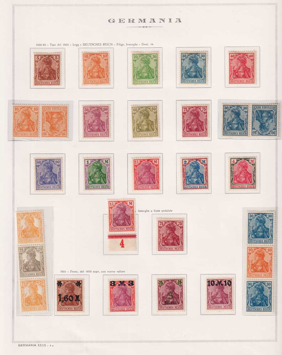 COLLEZIONE AVANZATA DELLA GERMANIA COMPRESI ANCHE ALCUNI ANTICHI STATI E FOGLIETTI SU FOGLI D'ALBUM MARINI. TUTTI I FRANCOBOLLI PRESENTI NELLA RACCOLTA SONO VISIBILI NELLE SCANSIONI, SONO IN OTTIMO STATO DI CONSERVAZIONE E PREVALENTEMENTE CON GOMMA ORIGINALE. DAL 1940 ALCUNE SERIETTE CON GOMMA INTEGRA ORIGINALE. 3 CERTIFICATI.
