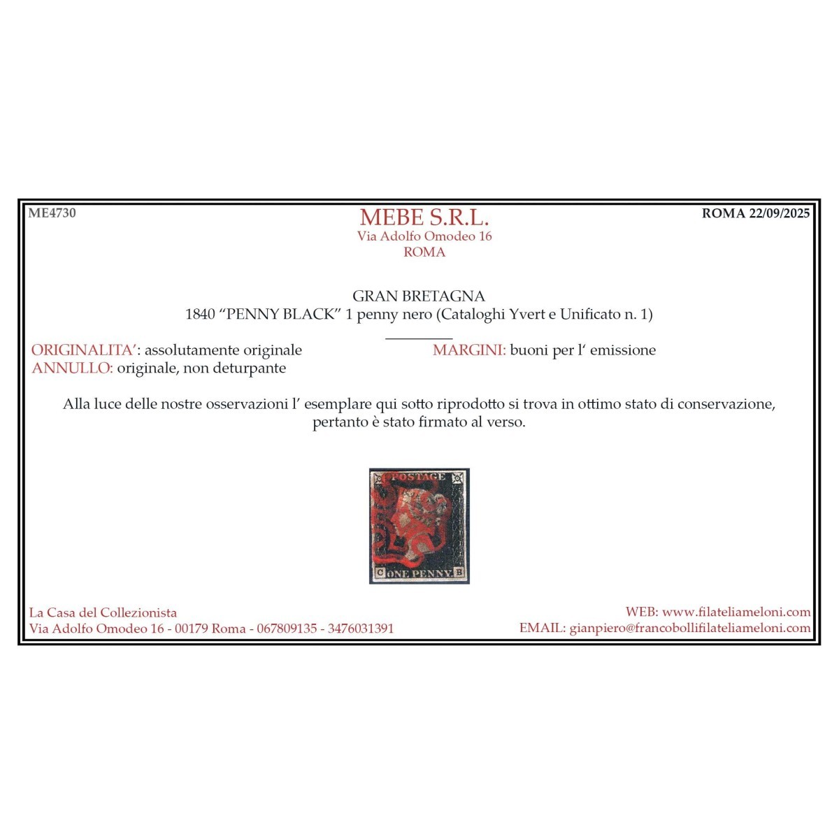 GRAN BRETAGNA 1840 1 PENNY NERO BLACK N.1 US. MARGINATO CERT.