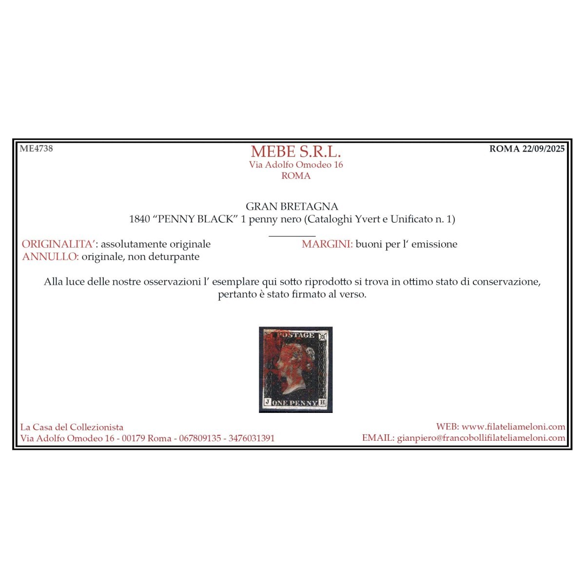 GRAN BRETAGNA 1840 1 PENNY NERO BLACK N.1 US. MARGINATO CERT.