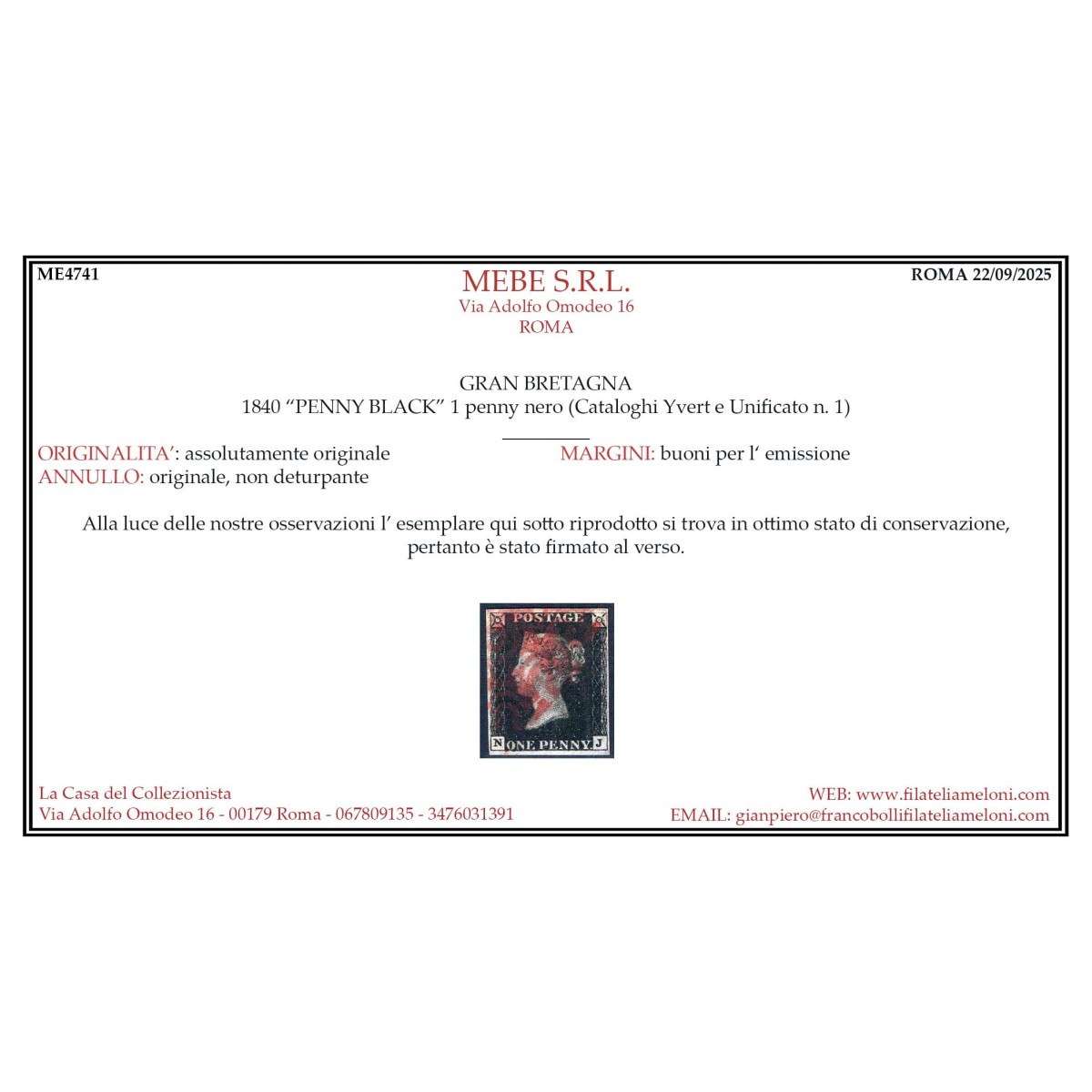 GRAN BRETAGNA 1840 1 PENNY NERO BLACK N.1 US. MARGINATO CERT.