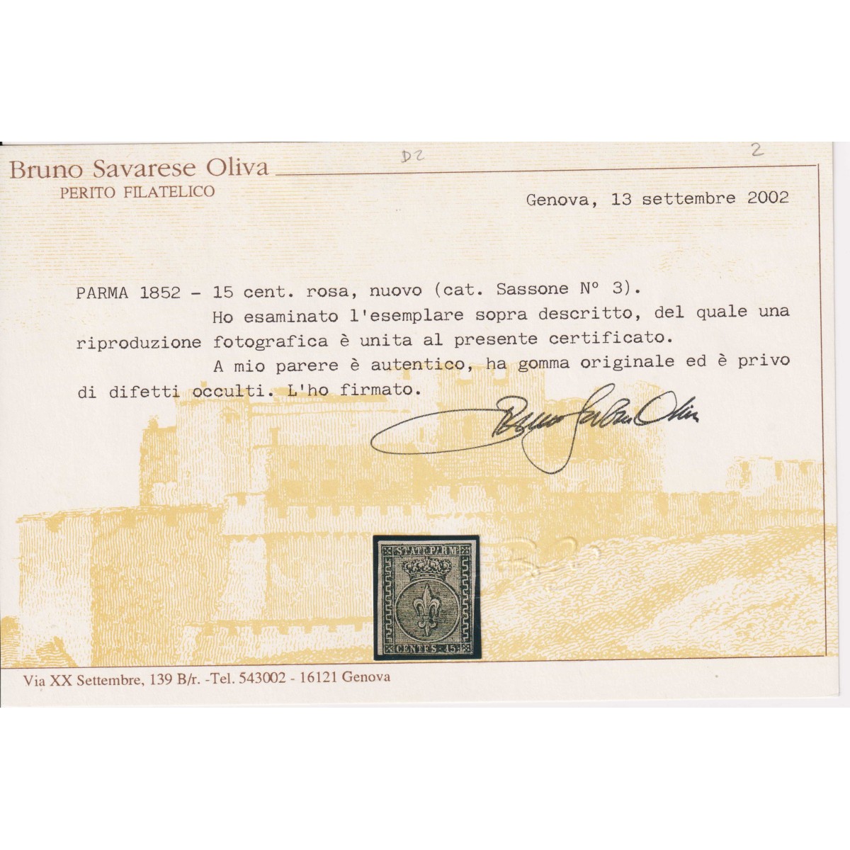 PARMA 1852 15 CENTESIMI ROSA N.3 G.O MH* CERT.