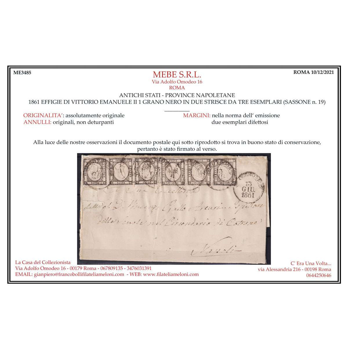 PROVINCE NAPOLETANE 1861 1 GRANO 2 STRISCE DI 3 VALORI USATI SU BUSTA CERT.