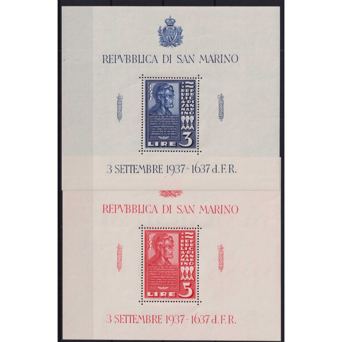 SAN MARINO 1938 FOGLIETTI LINCOLN 2 V. N.2-3 G.I MNH**