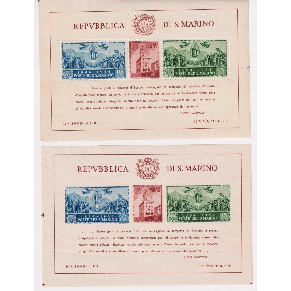 SAN MARINO 1945 FOGLIETTI CARDUCCI 2 V. N.6-7...