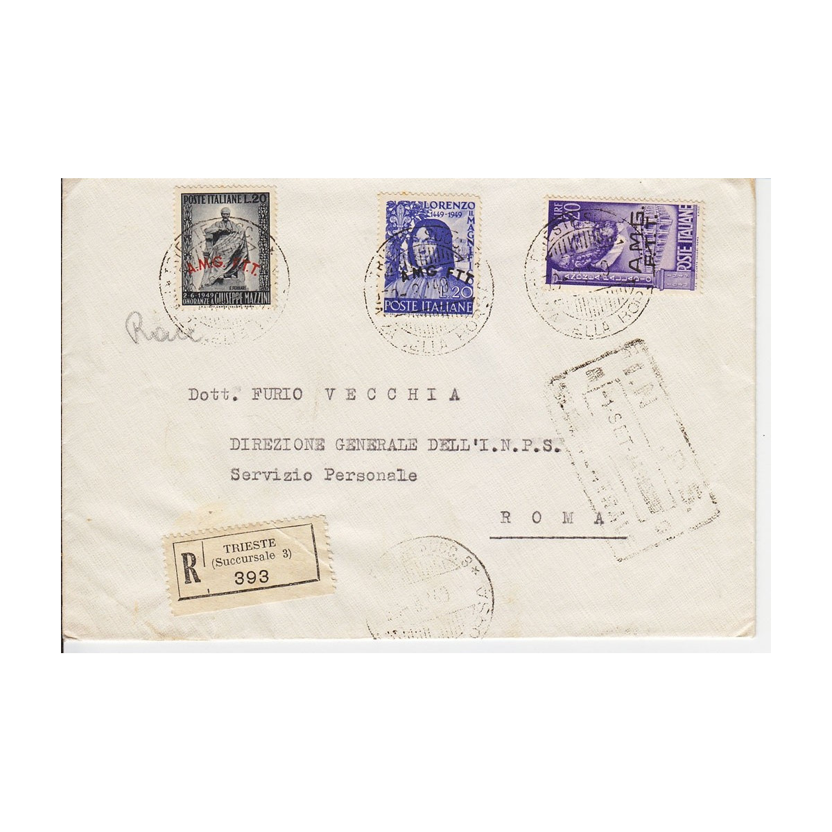 1949 TRIESTE "A" 20 L. PALLADIO + Nn. 47-49-50 (SAS.) SU BUSTA VIAGGIATA US.
