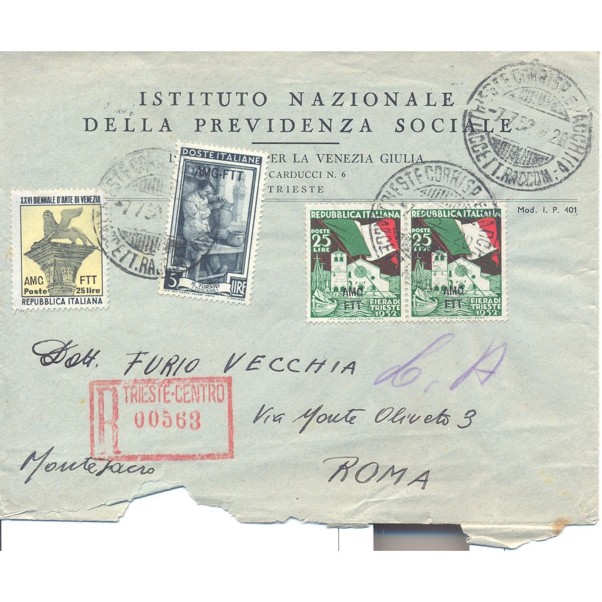 1952 TRIESTE "A" 2X FIERA TRIESTE 25L N.152 + 25L N.150 BUSTA VIAGGIATA
